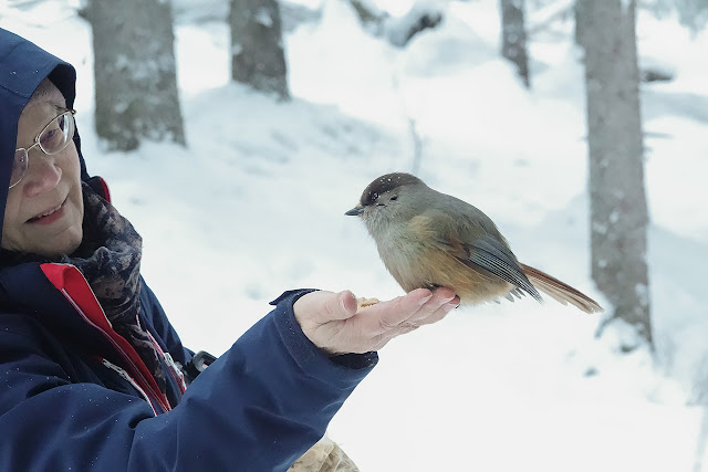Kotimatkalla käymme Konttaisen parkkipaikan lintuja katsomassa. Heti kun kaivan taskustani keksimurupussin, pölähtää ympärille useita tiaisia ja kuukkeleita. Hömötiaiset ovat rohkeimpia. Kun ojennan käteni, se tulee hakemaan ruokaa.
