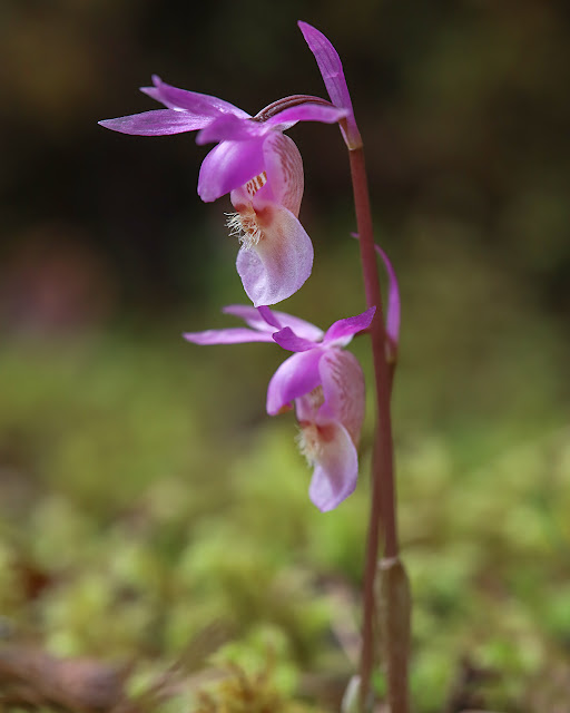 Vielä piipahdus kämmekkäpaikalle, jossa olen yleensä käynyt tikankontin kukinta-aikaan. Nyt polulla virtasi vesi, mutta metsänpohjaa pilkuttivat pienet lilanpunaiset neidonkengät. Täältä niitä löytyi monen kukan ryhminäkin, joten vietin pitkän tovin niitä ihaillen ja kuvaten.